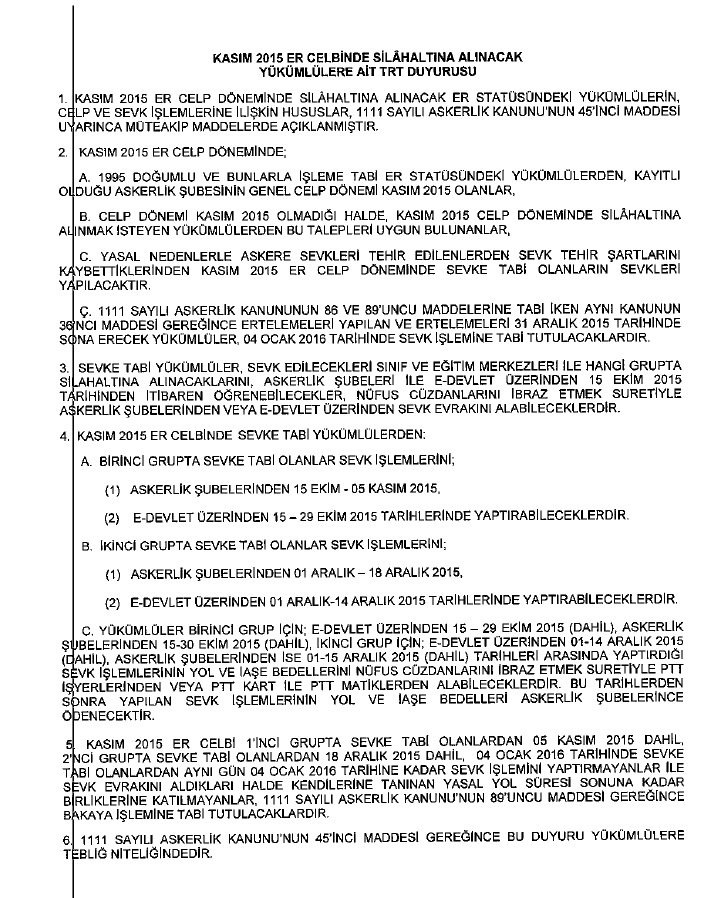 Milli Savunma Bakanlığının Kasım 2015 er celp döneminde silah altına alınacak er statüsündeki yükümlülerin, celp ve sevk faaliyetlerine ait tebliğ yerine geçecek duyuru, 1111 sayılı Kanunun 45. maddesi gereğince ekte sunulmuştur.
