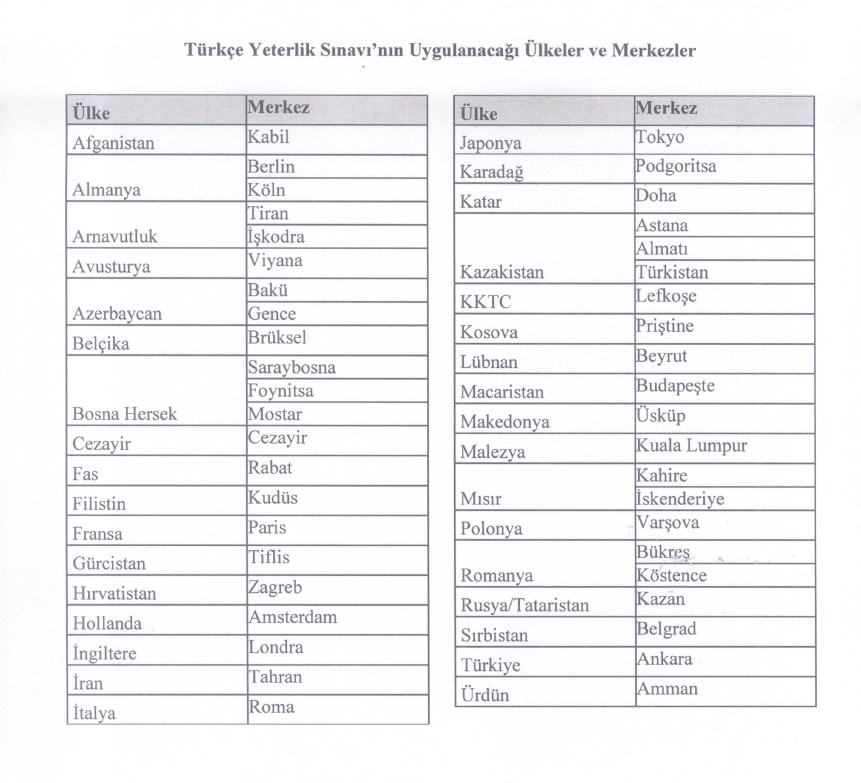 Türkçe Yeterlilik Sınavının Uygulanacağı Ülkeler ve Merkezler