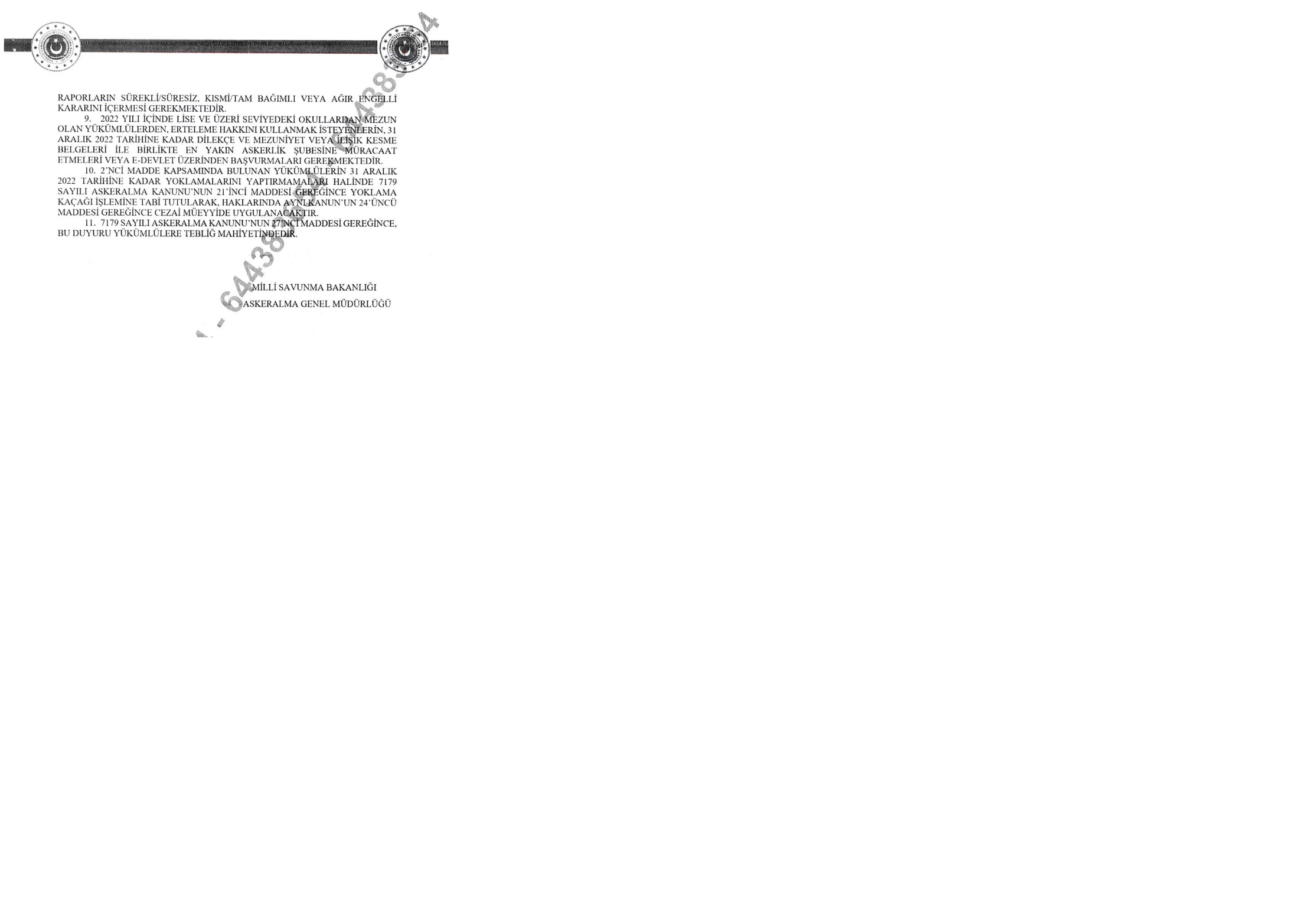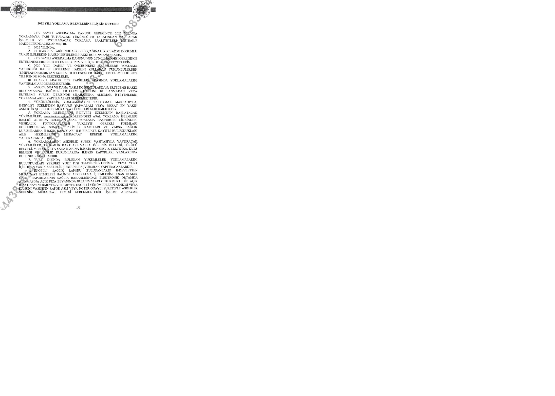 2022 Yılı Askerlik Yoklama Duyurusu